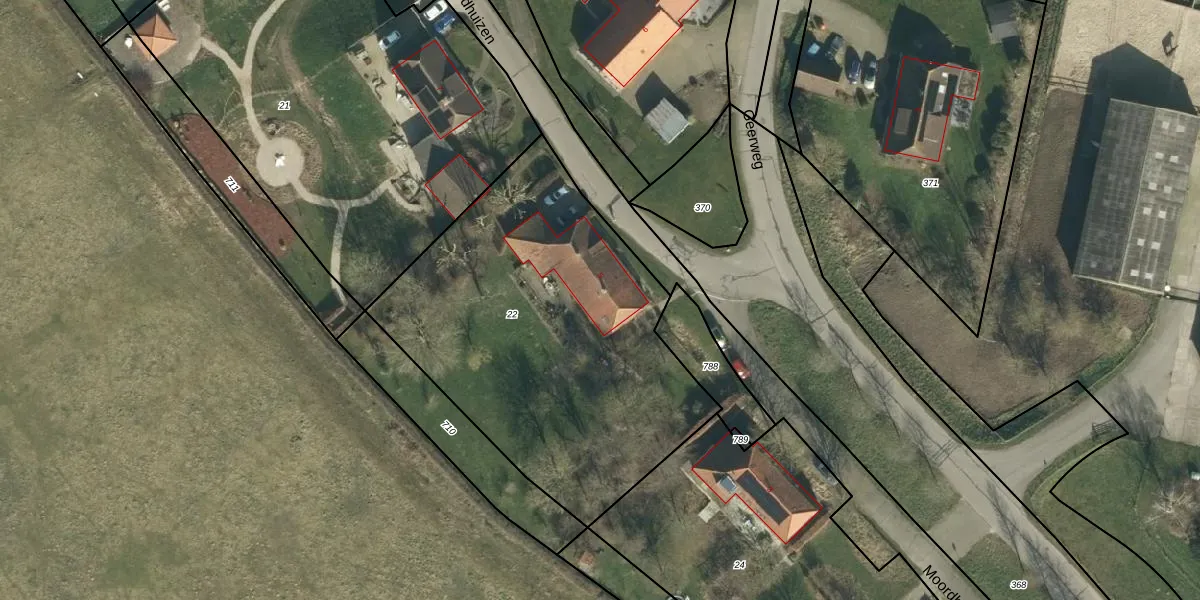 Het perceel waarop Moordhuizen 5 staat heeft een oppervlakte van 1780 m². Dit is een zeer groot perceel. De perceeloppervlakte wordt geregistreerd door het Kadaster. Gedetailleerde informatie over de maten van dit perceel kunt u vinden in het rapport Kadastrale kaart met maatvoering van Moordhuizen 5.