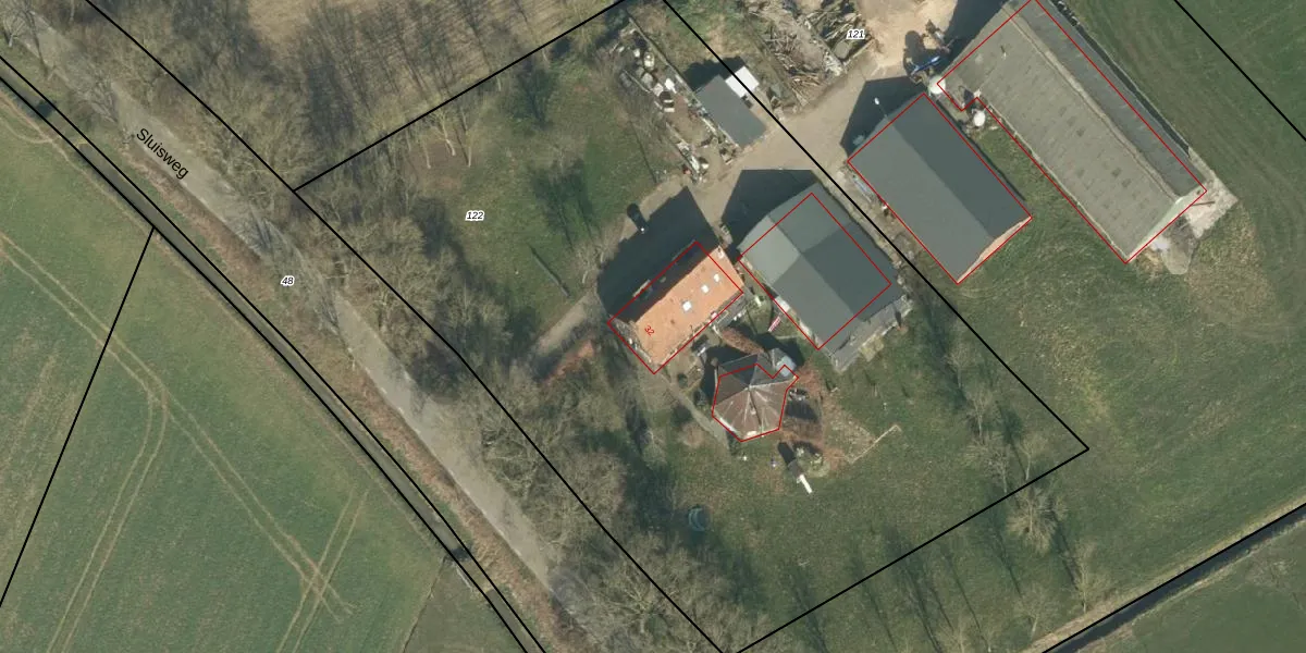 Het perceel waarop Sluisweg 32 staat heeft een oppervlakte van 5990 m². Dit is een zeer groot perceel. De perceeloppervlakte wordt geregistreerd door het Kadaster. Gedetailleerde informatie over de maten van dit perceel kunt u vinden in het rapport Kadastrale kaart met maatvoering van Sluisweg 32.