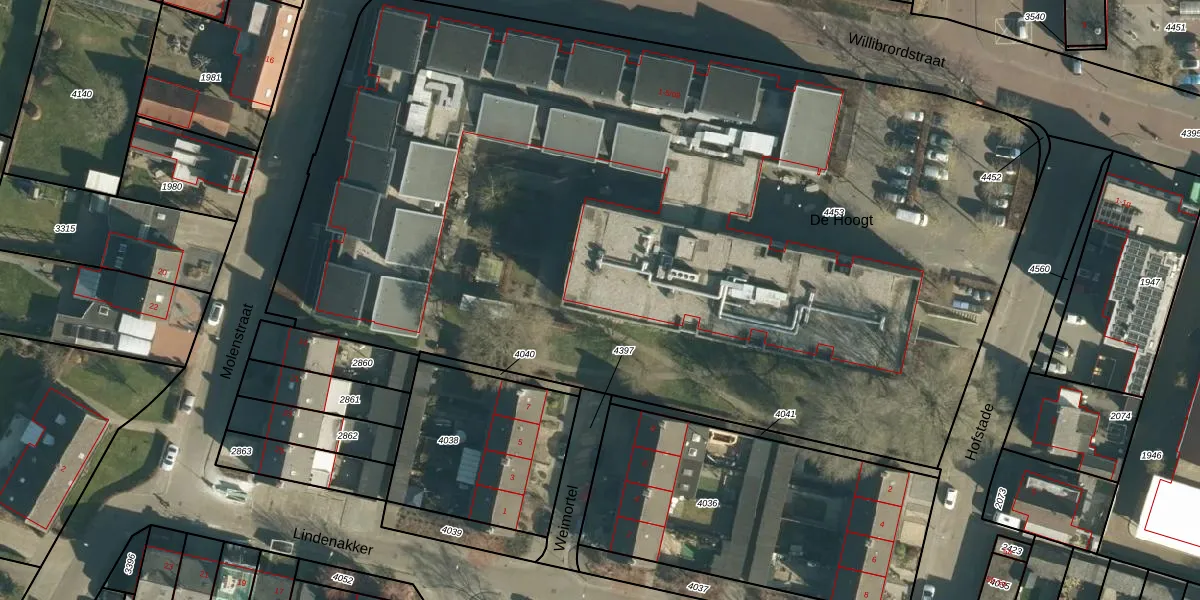 Het perceel waarop Willibrordstraat 1-08 staat heeft een oppervlakte van 6845 m². Dit is een zeer groot perceel. De perceeloppervlakte wordt geregistreerd door het Kadaster. Gedetailleerde informatie over de maten van dit perceel kunt u vinden in het rapport Kadastrale kaart met maatvoering van Willibrordstraat 1-08.
