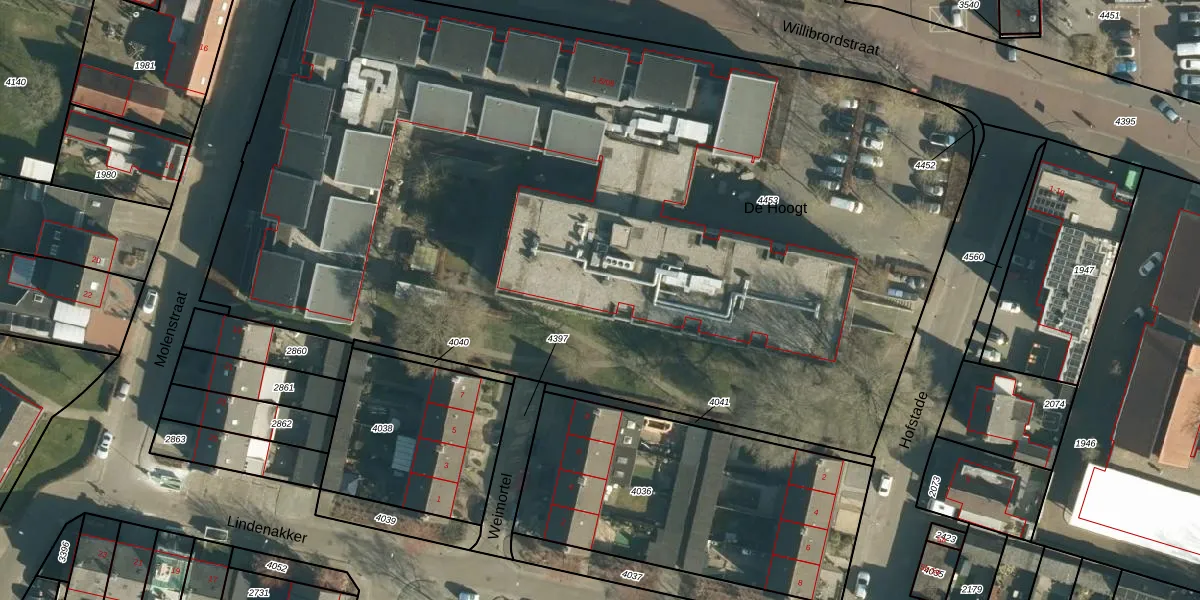 Het perceel waarop Willibrordstraat 1-09 staat heeft een oppervlakte van 6845 m². Dit is een zeer groot perceel. De perceeloppervlakte wordt geregistreerd door het Kadaster. Gedetailleerde informatie over de maten van dit perceel kunt u vinden in het rapport Kadastrale kaart met maatvoering van Willibrordstraat 1-09.