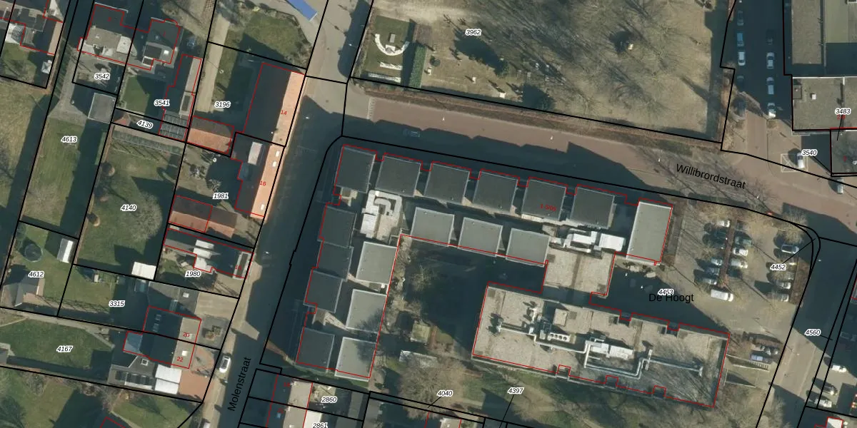 Het perceel waarop Willibrordstraat 1-405 staat heeft een oppervlakte van 6845 m². Dit is een zeer groot perceel. De perceeloppervlakte wordt geregistreerd door het Kadaster. Gedetailleerde informatie over de maten van dit perceel kunt u vinden in het rapport Kadastrale kaart met maatvoering van Willibrordstraat 1-405.