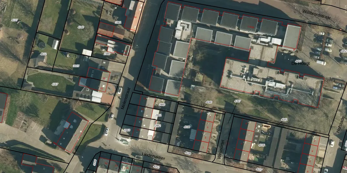 Het perceel waarop Willibrordstraat 3-12 staat heeft een oppervlakte van 6845 m². Dit is een zeer groot perceel. De perceeloppervlakte wordt geregistreerd door het Kadaster. Gedetailleerde informatie over de maten van dit perceel kunt u vinden in het rapport Kadastrale kaart met maatvoering van Willibrordstraat 3-12.