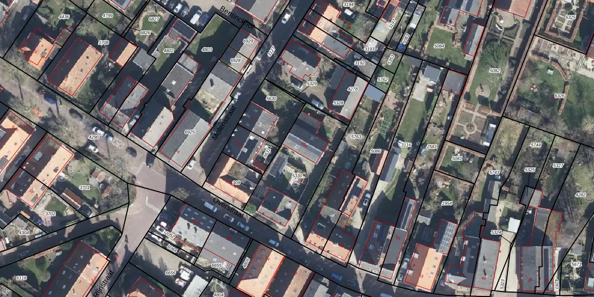 Het perceel waarop Overstraat 65-a staat heeft een oppervlakte van 735 m². Dit is een groot perceel. De perceeloppervlakte wordt geregistreerd door het Kadaster. Gedetailleerde informatie over de maten van dit perceel kunt u vinden in het rapport Kadastrale kaart met maatvoering van Overstraat 65-a.