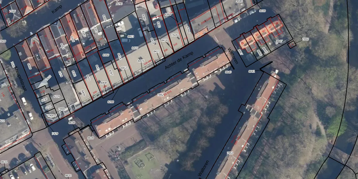 Het perceel waarop het adres ligt is AMF00-E-7852. De afkorting 'AMF00' staat voor kadastrale gemeente Amersfoort. De gemiddelde perceelgrootte in Amersfoort is 959,94 m². Dit perceel is kleiner: de perceeloppervlakte bedraagt 910 m². Het kleinste perceel in de kadastrale gemeente is 0 m² groot. De grootste perceeloppervlakte is 1,12 km². Er zijn 56 adressen aanwezig op het perceel. De laatste wijziging in het de Basisregistratie Kadaster (BRK) was op 29-01-2003.