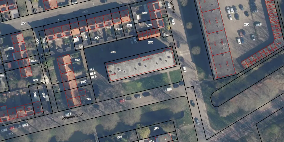 Albatrosstraat 55 is gelegen op kadastraal perceel AMF00A5059. Deze kadastrale aanduiding is uniek en wordt gebruikt door het Kadaster om eigendomsrechten en andere zakelijke rechten vast te leggen. Het perceel maakt onderdeel uit van de kadastrale gemeente Amersfoort.