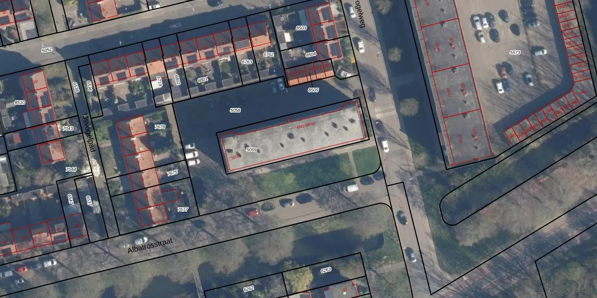 Albatrosstraat 56 is gelegen op kadastraal perceel AMF00A5059. Deze kadastrale aanduiding is uniek en wordt gebruikt door het Kadaster om eigendomsrechten en andere zakelijke rechten vast te leggen. Het perceel maakt onderdeel uit van de kadastrale gemeente Amersfoort.