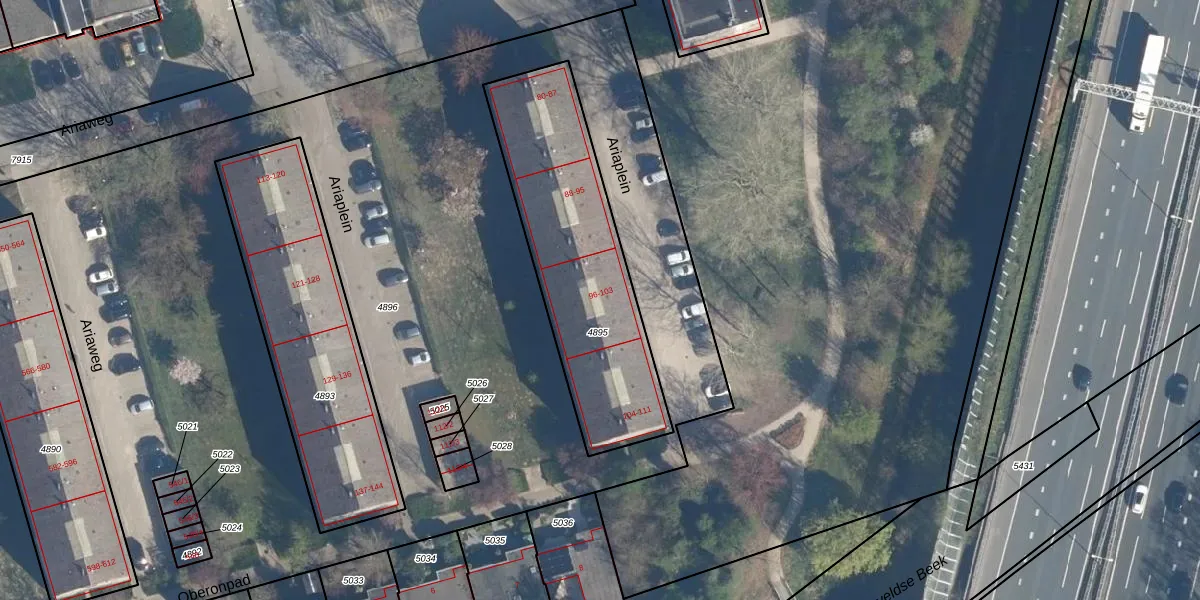 Het perceel waarop Ariaplein 101 staat heeft een oppervlakte van 955 m². Dit is een groot perceel. De perceeloppervlakte wordt geregistreerd door het Kadaster. Gedetailleerde informatie over de maten van dit perceel kunt u vinden in het rapport Kadastrale kaart met maatvoering van Ariaplein 101.