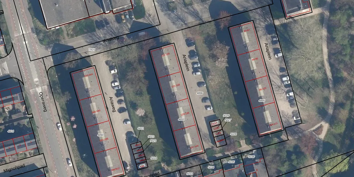 Het perceel waarop Ariaplein 128 staat heeft een oppervlakte van 957 m². Dit is een groot perceel. De perceeloppervlakte wordt geregistreerd door het Kadaster. Gedetailleerde informatie over de maten van dit perceel kunt u vinden in het rapport Kadastrale kaart met maatvoering van Ariaplein 128.