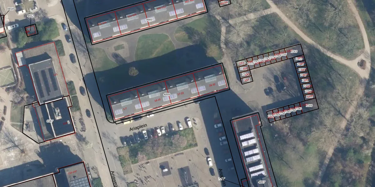 Het perceel waarop Ariaplein 23 staat heeft een oppervlakte van 957 m². Dit is een groot perceel. De perceeloppervlakte wordt geregistreerd door het Kadaster. Gedetailleerde informatie over de maten van dit perceel kunt u vinden in het rapport Kadastrale kaart met maatvoering van Ariaplein 23.