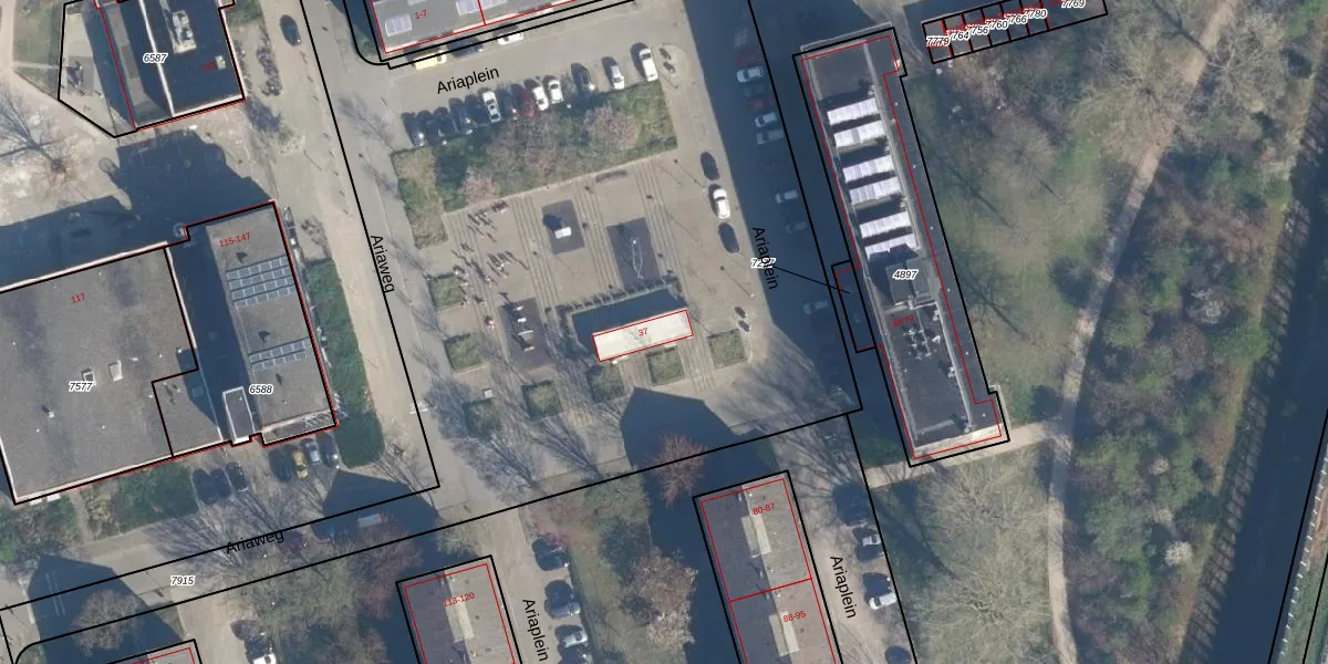 Ariaplein 37 is gelegen op kadastraal perceel AMF00A7915. Deze kadastrale aanduiding is uniek en wordt gebruikt door het Kadaster om eigendomsrechten en andere zakelijke rechten vast te leggen. Het perceel maakt onderdeel uit van de kadastrale gemeente Amersfoort.