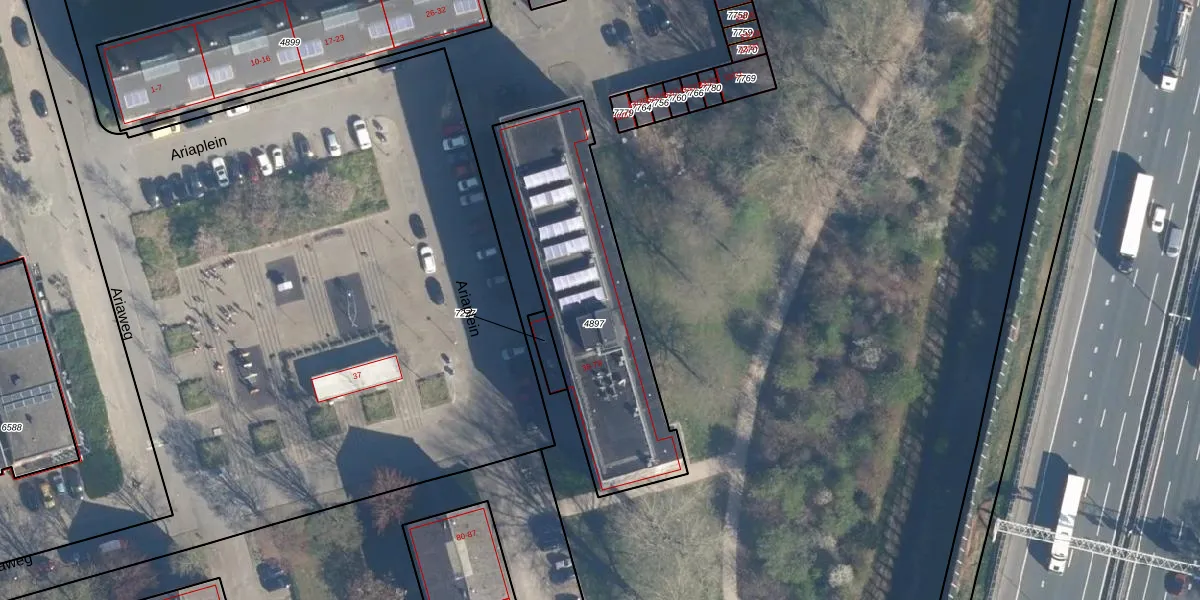 Het perceel waarop Ariaplein 76 staat heeft een oppervlakte van 959 m². Dit is een groot perceel. De perceeloppervlakte wordt geregistreerd door het Kadaster. Gedetailleerde informatie over de maten van dit perceel kunt u vinden in het rapport Kadastrale kaart met maatvoering van Ariaplein 76.
