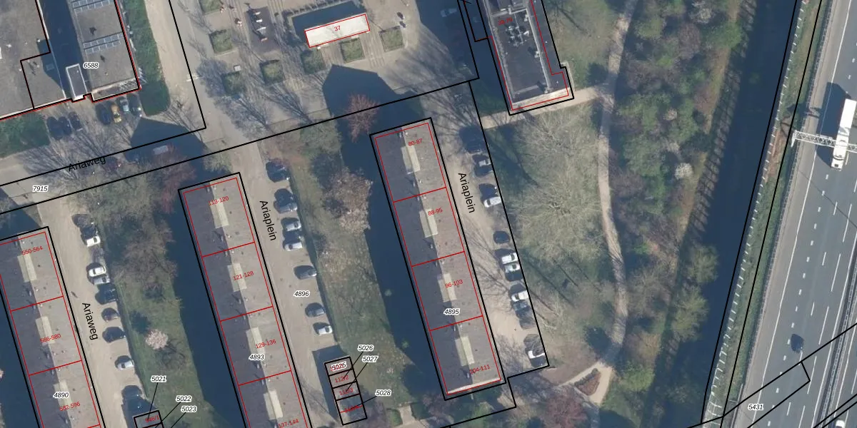 Het perceel waarop Ariaplein 88 staat heeft een oppervlakte van 955 m². Dit is een groot perceel. De perceeloppervlakte wordt geregistreerd door het Kadaster. Gedetailleerde informatie over de maten van dit perceel kunt u vinden in het rapport Kadastrale kaart met maatvoering van Ariaplein 88.