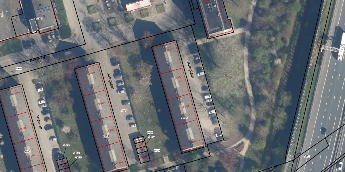 Het perceel waarop Ariaplein 94 staat heeft een oppervlakte van 955 m². Dit is een groot perceel. De perceeloppervlakte wordt geregistreerd door het Kadaster. Gedetailleerde informatie over de maten van dit perceel kunt u vinden in het rapport Kadastrale kaart met maatvoering van Ariaplein 94.
