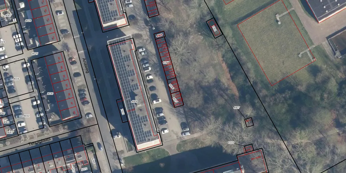 Het perceel waarop Ariaweg 106-12 staat heeft een oppervlakte van 44 m². Dit is een klein perceel. De perceeloppervlakte wordt geregistreerd door het Kadaster. Gedetailleerde informatie over de maten van dit perceel kunt u vinden in het rapport Kadastrale kaart met maatvoering van Ariaweg 106-12.