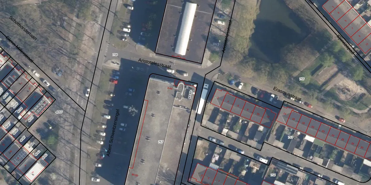 Het perceel waarop Aristotelesstraat 16 staat heeft een oppervlakte van 1755 m². Dit is een zeer groot perceel. De perceeloppervlakte wordt geregistreerd door het Kadaster. Gedetailleerde informatie over de maten van dit perceel kunt u vinden in het rapport Kadastrale kaart met maatvoering van Aristotelesstraat 16.
