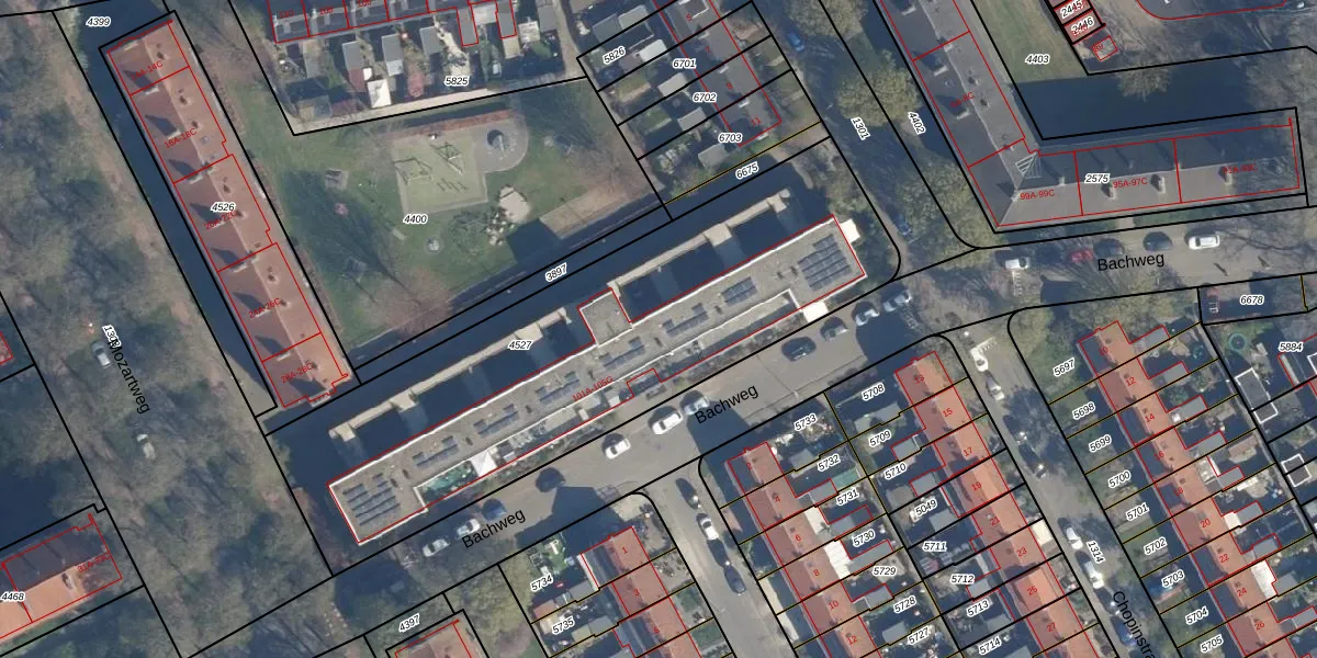 Bachweg 105-E is gelegen op kadastraal perceel AMF00G4527. Deze kadastrale aanduiding is uniek en wordt gebruikt door het Kadaster om eigendomsrechten en andere zakelijke rechten vast te leggen. Het perceel maakt onderdeel uit van de kadastrale gemeente Amersfoort.