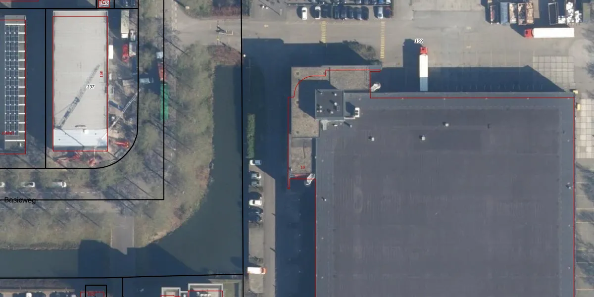 Het perceel waarop Basicweg 10 staat heeft een oppervlakte van 1,5 ha. Dit is een zeer groot perceel. De perceeloppervlakte wordt geregistreerd door het Kadaster. Gedetailleerde informatie over de maten van dit perceel kunt u vinden in het rapport Kadastrale kaart met maatvoering van Basicweg 10.