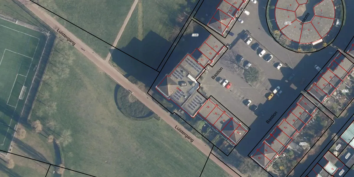 Het perceel waarop Bastion 35 staat heeft een oppervlakte van 1850 m². Dit is een zeer groot perceel. De perceeloppervlakte wordt geregistreerd door het Kadaster. Gedetailleerde informatie over de maten van dit perceel kunt u vinden in het rapport Kadastrale kaart met maatvoering van Bastion 35.
