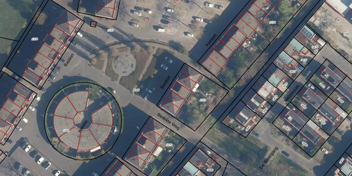Het perceel waarop Bastion 63 staat heeft een oppervlakte van 815 m². Dit is een groot perceel. De perceeloppervlakte wordt geregistreerd door het Kadaster. Gedetailleerde informatie over de maten van dit perceel kunt u vinden in het rapport Kadastrale kaart met maatvoering van Bastion 63.
