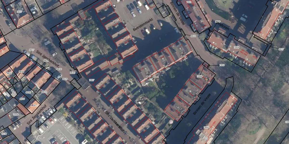 Het perceel waarop Beestenmarkt 20 staat heeft een oppervlakte van 1,2 ha. Dit is een zeer groot perceel. De perceeloppervlakte wordt geregistreerd door het Kadaster. Gedetailleerde informatie over de maten van dit perceel kunt u vinden in het rapport Kadastrale kaart met maatvoering van Beestenmarkt 20.