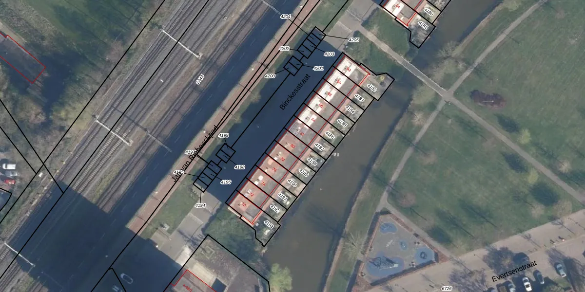 Het perceel waarop Binckesstraat 80 staat heeft een oppervlakte van 98 m². Dit is een klein perceel. De perceeloppervlakte wordt geregistreerd door het Kadaster. Gedetailleerde informatie over de maten van dit perceel kunt u vinden in het rapport Kadastrale kaart met maatvoering van Binckesstraat 80.