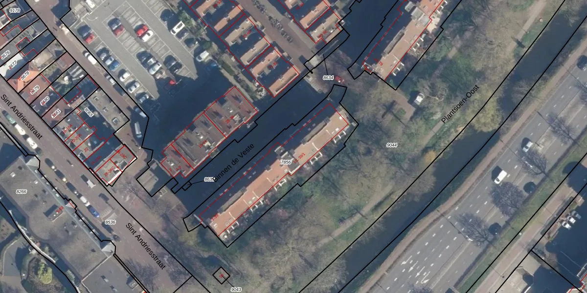 Het perceel waarop Binnen de Veste 13 staat heeft een oppervlakte van 1090 m². Dit is een zeer groot perceel. De perceeloppervlakte wordt geregistreerd door het Kadaster. Gedetailleerde informatie over de maten van dit perceel kunt u vinden in het rapport Kadastrale kaart met maatvoering van Binnen de Veste 13.