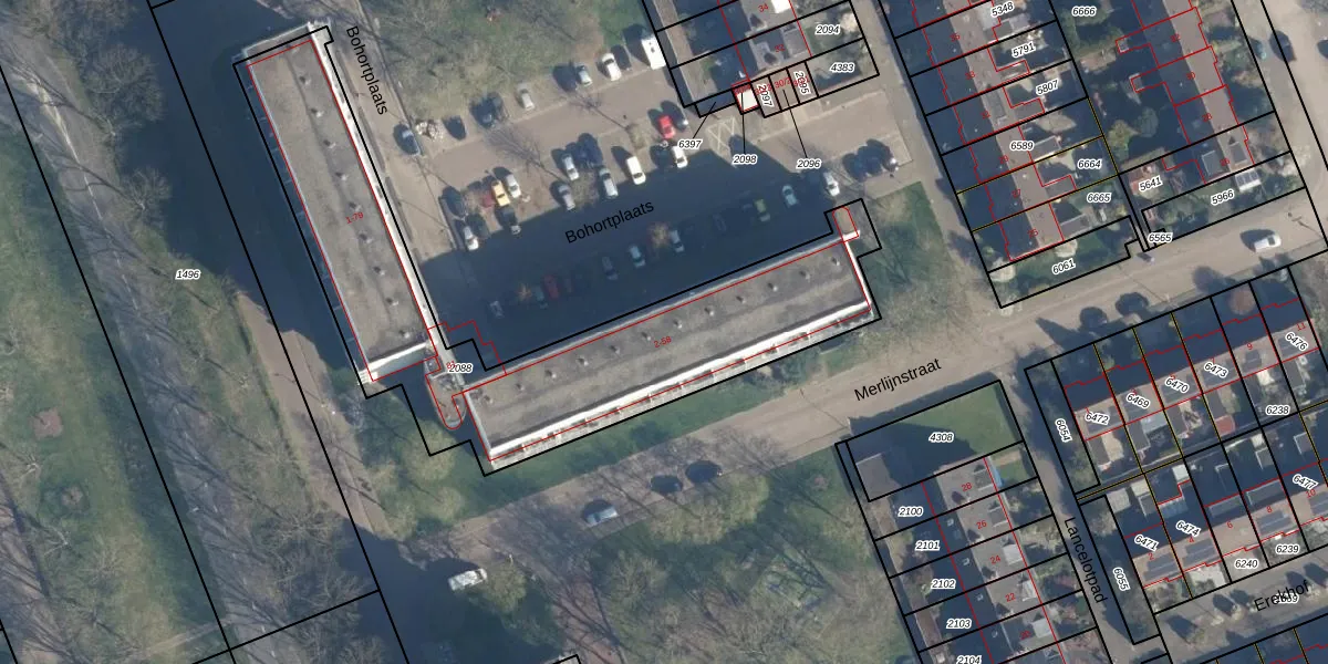 Het perceel waarop Bohortplaats 28 staat heeft een oppervlakte van 1869 m². Dit is een zeer groot perceel. De perceeloppervlakte wordt geregistreerd door het Kadaster. Gedetailleerde informatie over de maten van dit perceel kunt u vinden in het rapport Kadastrale kaart met maatvoering van Bohortplaats 28.