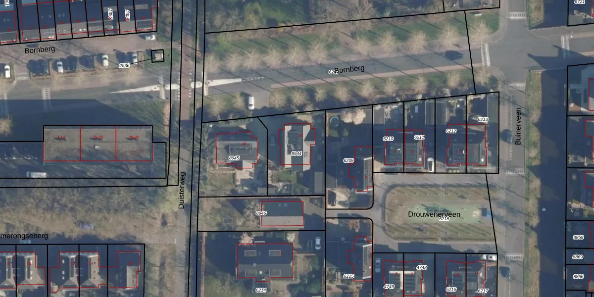 Het perceel waarop Bornberg 42 staat heeft een oppervlakte van 546 m². Dit is een groot perceel. De perceeloppervlakte wordt geregistreerd door het Kadaster. Gedetailleerde informatie over de maten van dit perceel kunt u vinden in het rapport Kadastrale kaart met maatvoering van Bornberg 42.