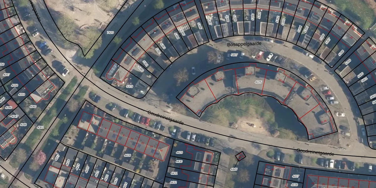 Bosappelgaarde 1 is gelegen op kadastraal perceel AMF00O4225. Deze kadastrale aanduiding is uniek en wordt gebruikt door het Kadaster om eigendomsrechten en andere zakelijke rechten vast te leggen. Het perceel maakt onderdeel uit van de kadastrale gemeente Amersfoort.