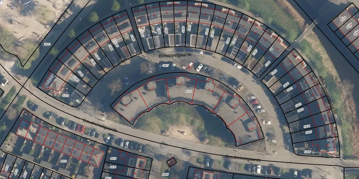 Het perceel waarop Bosappelgaarde 17 staat heeft een oppervlakte van 1480 m². Dit is een zeer groot perceel. De perceeloppervlakte wordt geregistreerd door het Kadaster. Gedetailleerde informatie over de maten van dit perceel kunt u vinden in het rapport Kadastrale kaart met maatvoering van Bosappelgaarde 17.