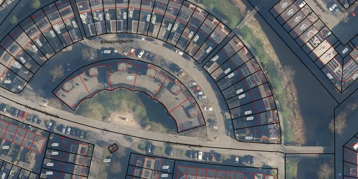 Het perceel waarop Bosappelgaarde 25 staat heeft een oppervlakte van 1480 m². Dit is een zeer groot perceel. De perceeloppervlakte wordt geregistreerd door het Kadaster. Gedetailleerde informatie over de maten van dit perceel kunt u vinden in het rapport Kadastrale kaart met maatvoering van Bosappelgaarde 25.