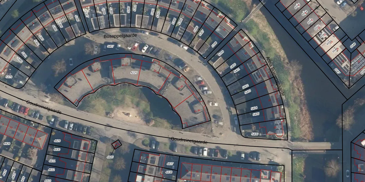 Het perceel waarop Bosappelgaarde 28 staat heeft een oppervlakte van 1480 m². Dit is een zeer groot perceel. De perceeloppervlakte wordt geregistreerd door het Kadaster. Gedetailleerde informatie over de maten van dit perceel kunt u vinden in het rapport Kadastrale kaart met maatvoering van Bosappelgaarde 28.