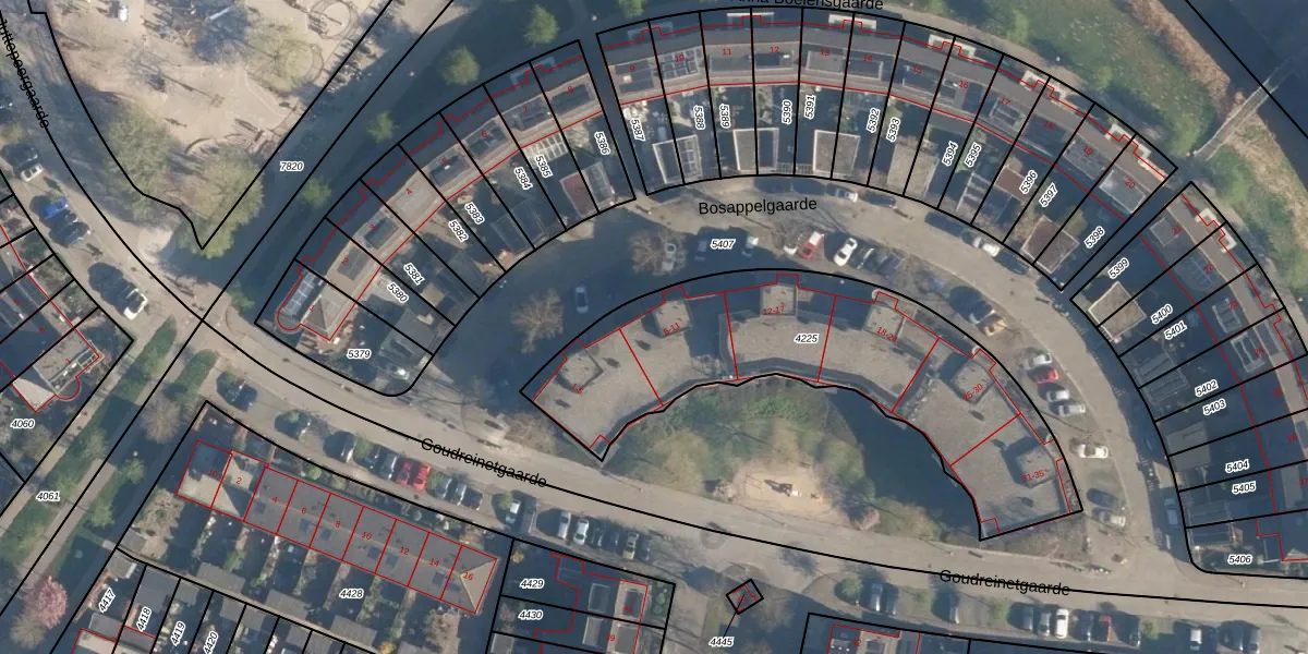 Het perceel waarop Bosappelgaarde 6 staat heeft een oppervlakte van 1480 m². Dit is een zeer groot perceel. De perceeloppervlakte wordt geregistreerd door het Kadaster. Gedetailleerde informatie over de maten van dit perceel kunt u vinden in het rapport Kadastrale kaart met maatvoering van Bosappelgaarde 6.