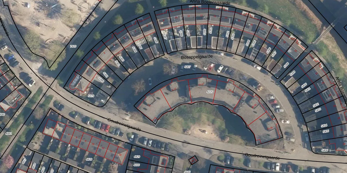 Het perceel waarop Bosappelgaarde 7 staat heeft een oppervlakte van 1480 m². Dit is een zeer groot perceel. De perceeloppervlakte wordt geregistreerd door het Kadaster. Gedetailleerde informatie over de maten van dit perceel kunt u vinden in het rapport Kadastrale kaart met maatvoering van Bosappelgaarde 7.