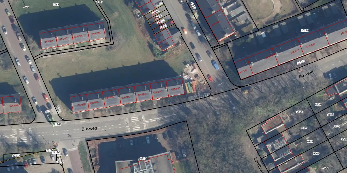 Het perceel waarop Bosweg 55-C staat heeft een oppervlakte van 7693 m². Dit is een zeer groot perceel. De perceeloppervlakte wordt geregistreerd door het Kadaster. Gedetailleerde informatie over de maten van dit perceel kunt u vinden in het rapport Kadastrale kaart met maatvoering van Bosweg 55-C.