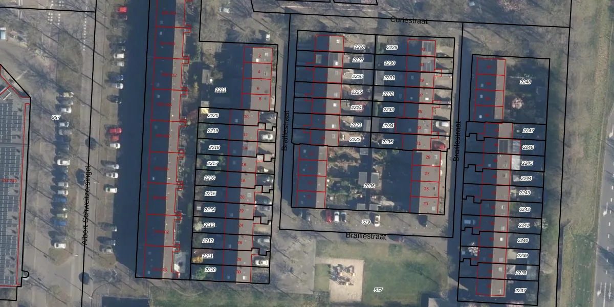 Braillestraat 15 is gelegen op kadastraal perceel AMF00N2236. Deze kadastrale aanduiding is uniek en wordt gebruikt door het Kadaster om eigendomsrechten en andere zakelijke rechten vast te leggen. Het perceel maakt onderdeel uit van de kadastrale gemeente Amersfoort.