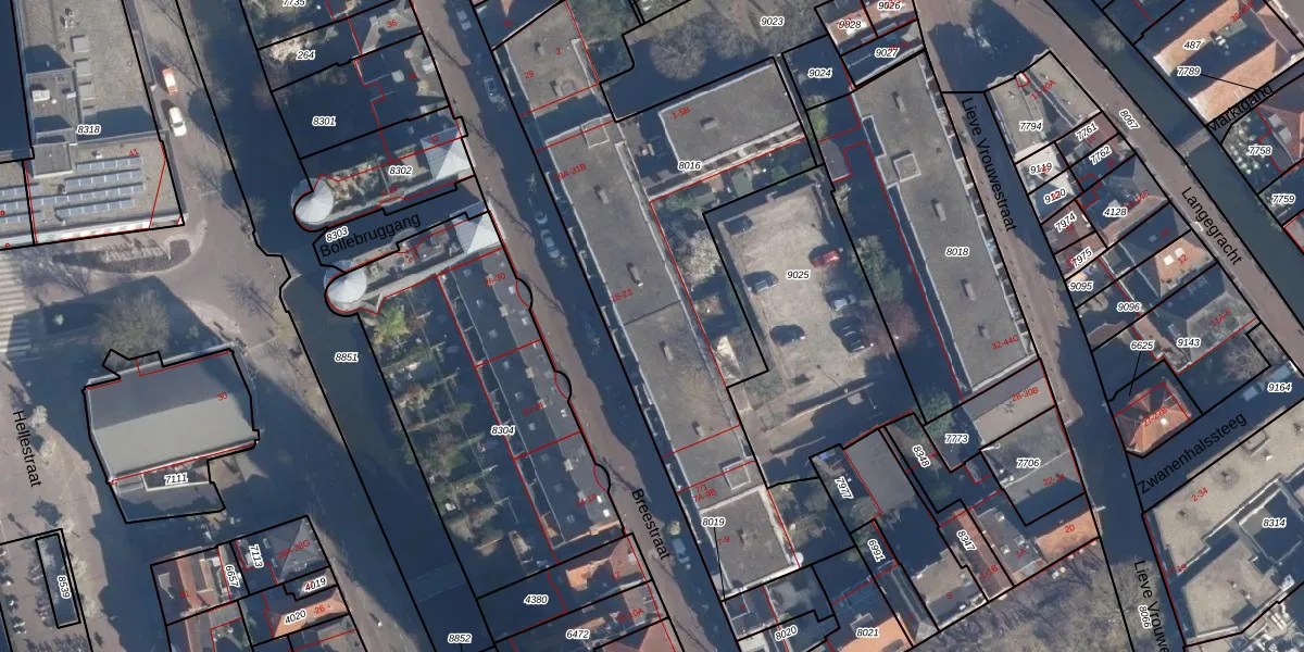 Het perceel waarop Breestraat 17-B staat heeft een oppervlakte van 2100 m². Dit is een zeer groot perceel. De perceeloppervlakte wordt geregistreerd door het Kadaster. Gedetailleerde informatie over de maten van dit perceel kunt u vinden in het rapport Kadastrale kaart met maatvoering van Breestraat 17-B.
