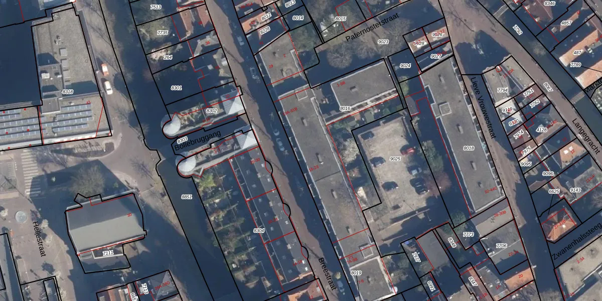 Het perceel waarop Breestraat 21 staat heeft een oppervlakte van 2100 m². Dit is een zeer groot perceel. De perceeloppervlakte wordt geregistreerd door het Kadaster. Gedetailleerde informatie over de maten van dit perceel kunt u vinden in het rapport Kadastrale kaart met maatvoering van Breestraat 21.