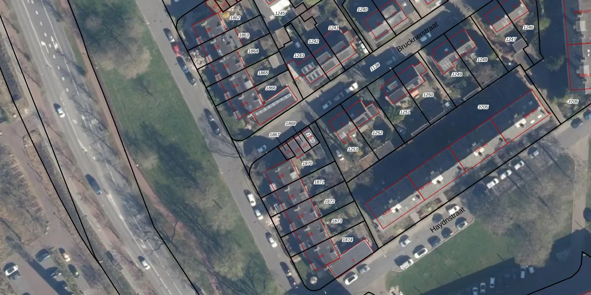 Het perceel waarop Brucknerstraat 1-2 staat heeft een oppervlakte van 300 m². Dit is een groot perceel. De perceeloppervlakte wordt geregistreerd door het Kadaster. Gedetailleerde informatie over de maten van dit perceel kunt u vinden in het rapport Kadastrale kaart met maatvoering van Brucknerstraat 1-2.