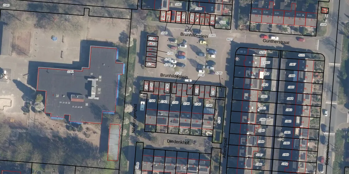 Het perceel waarop Brunhildeplein 1-8 staat heeft een oppervlakte van 19 m². Dit is een klein perceel. De perceeloppervlakte wordt geregistreerd door het Kadaster. Gedetailleerde informatie over de maten van dit perceel kunt u vinden in het rapport Kadastrale kaart met maatvoering van Brunhildeplein 1-8.
