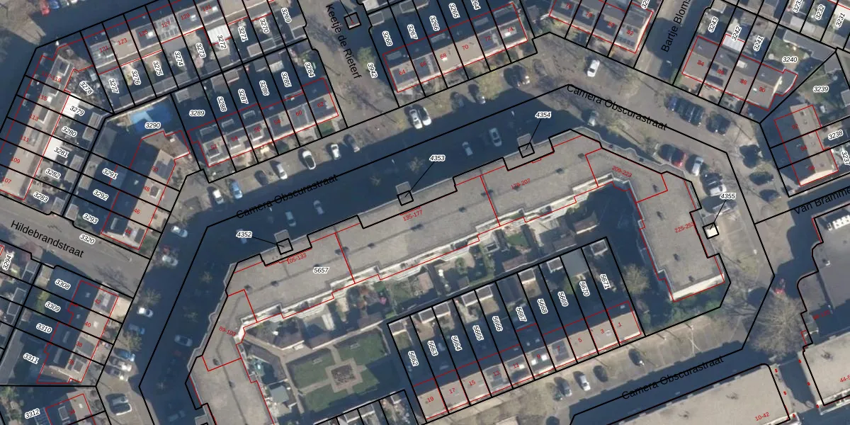 Het perceel waarop Camera Obscurastraat 159 staat heeft een oppervlakte van 4687 m². Dit is een zeer groot perceel. De perceeloppervlakte wordt geregistreerd door het Kadaster. Gedetailleerde informatie over de maten van dit perceel kunt u vinden in het rapport Kadastrale kaart met maatvoering van Camera Obscurastraat 159.
