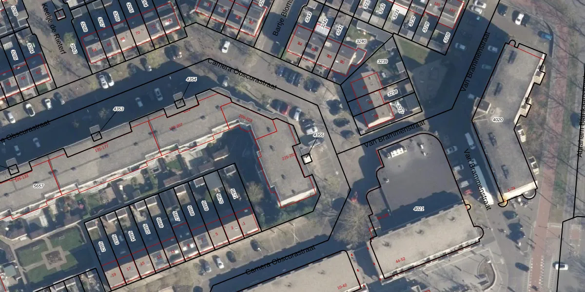 Het perceel waarop Camera Obscurastraat 229 staat heeft een oppervlakte van 4687 m². Dit is een zeer groot perceel. De perceeloppervlakte wordt geregistreerd door het Kadaster. Gedetailleerde informatie over de maten van dit perceel kunt u vinden in het rapport Kadastrale kaart met maatvoering van Camera Obscurastraat 229.