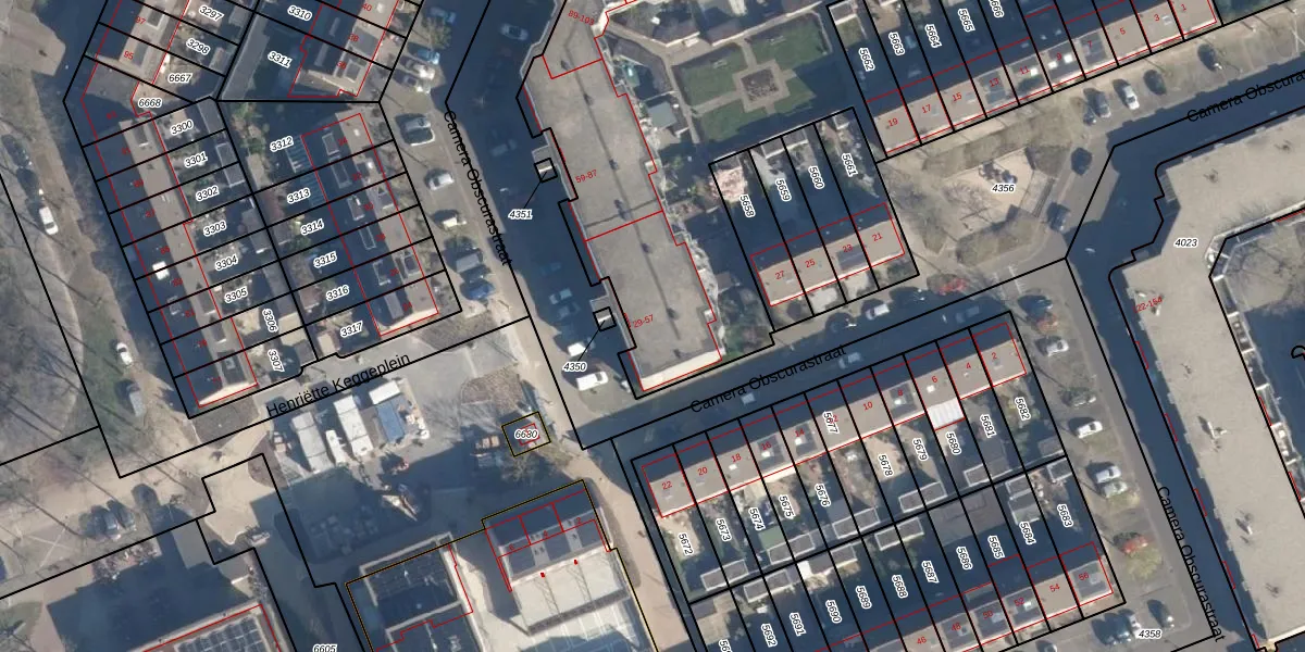 Het perceel waarop Camera Obscurastraat 55 staat heeft een oppervlakte van 4687 m². Dit is een zeer groot perceel. De perceeloppervlakte wordt geregistreerd door het Kadaster. Gedetailleerde informatie over de maten van dit perceel kunt u vinden in het rapport Kadastrale kaart met maatvoering van Camera Obscurastraat 55.