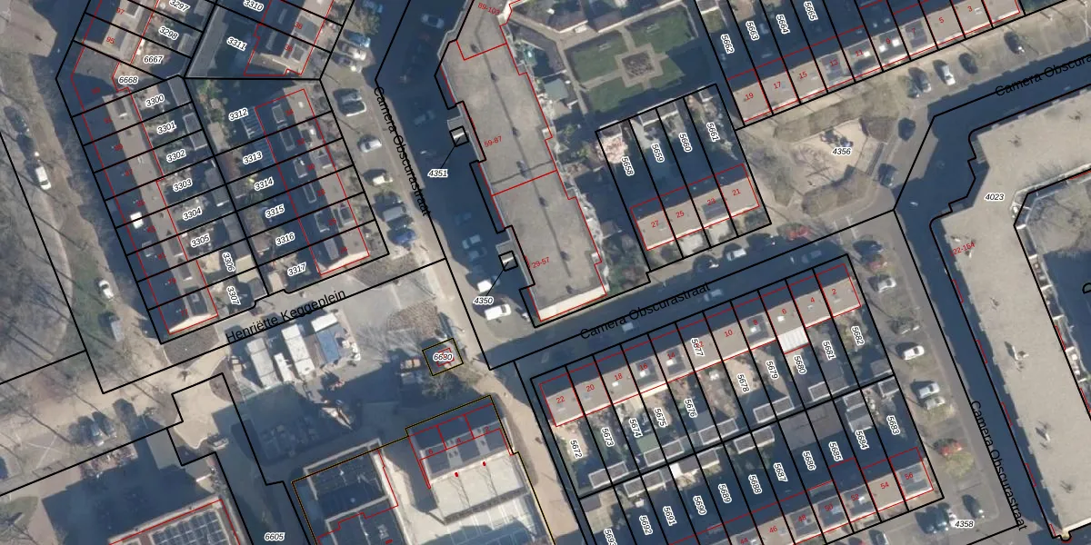 Camera Obscurastraat 57 is gelegen op kadastraal perceel AMF00K5657. Deze kadastrale aanduiding is uniek en wordt gebruikt door het Kadaster om eigendomsrechten en andere zakelijke rechten vast te leggen. Het perceel maakt onderdeel uit van de kadastrale gemeente Amersfoort.