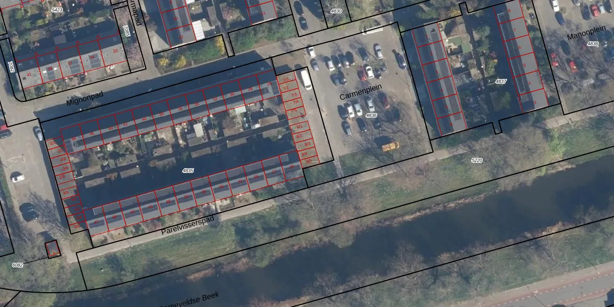 Het perceel waarop Carmenplein 8-4 staat heeft een oppervlakte van 3711 m². Dit is een zeer groot perceel. De perceeloppervlakte wordt geregistreerd door het Kadaster. Gedetailleerde informatie over de maten van dit perceel kunt u vinden in het rapport Kadastrale kaart met maatvoering van Carmenplein 8-4.
