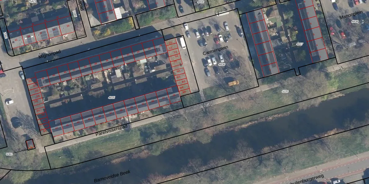 Het perceel waarop Carmenplein 8-5 staat heeft een oppervlakte van 3711 m². Dit is een zeer groot perceel. De perceeloppervlakte wordt geregistreerd door het Kadaster. Gedetailleerde informatie over de maten van dit perceel kunt u vinden in het rapport Kadastrale kaart met maatvoering van Carmenplein 8-5.