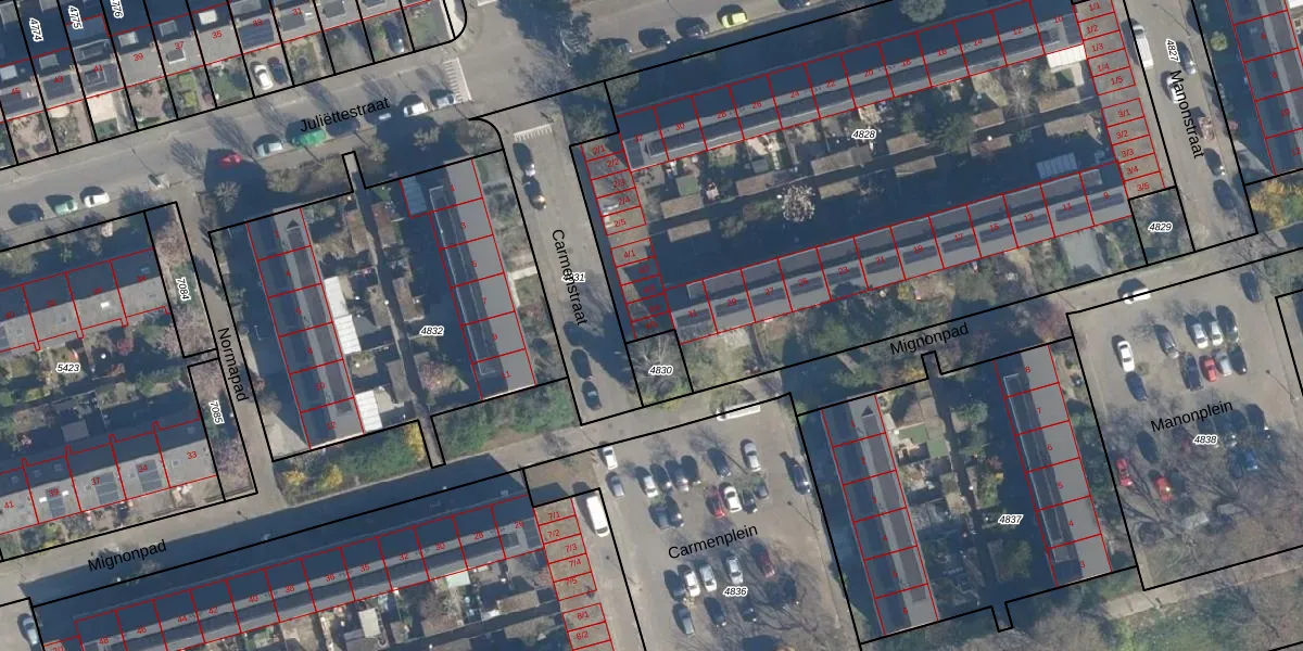 Het perceel waarop Carmenstraat 4-5 staat heeft een oppervlakte van 4108 m². Dit is een zeer groot perceel. De perceeloppervlakte wordt geregistreerd door het Kadaster. Gedetailleerde informatie over de maten van dit perceel kunt u vinden in het rapport Kadastrale kaart met maatvoering van Carmenstraat 4-5.