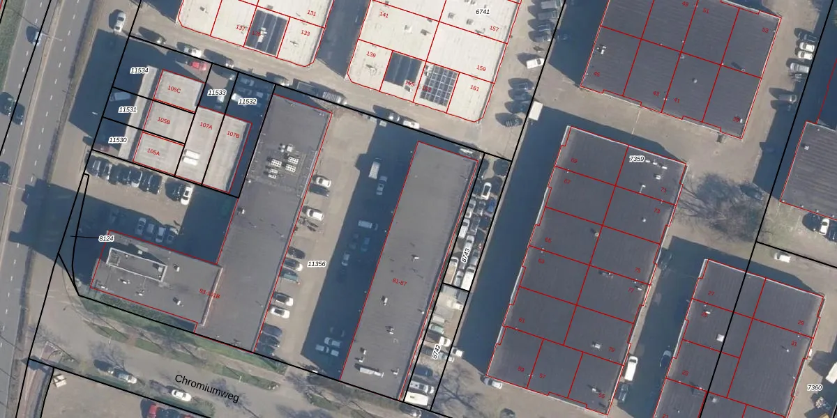 Het perceel waarop Chromiumweg 87 staat heeft een oppervlakte van 4435 m². Dit is een zeer groot perceel. De perceeloppervlakte wordt geregistreerd door het Kadaster. Gedetailleerde informatie over de maten van dit perceel kunt u vinden in het rapport Kadastrale kaart met maatvoering van Chromiumweg 87.