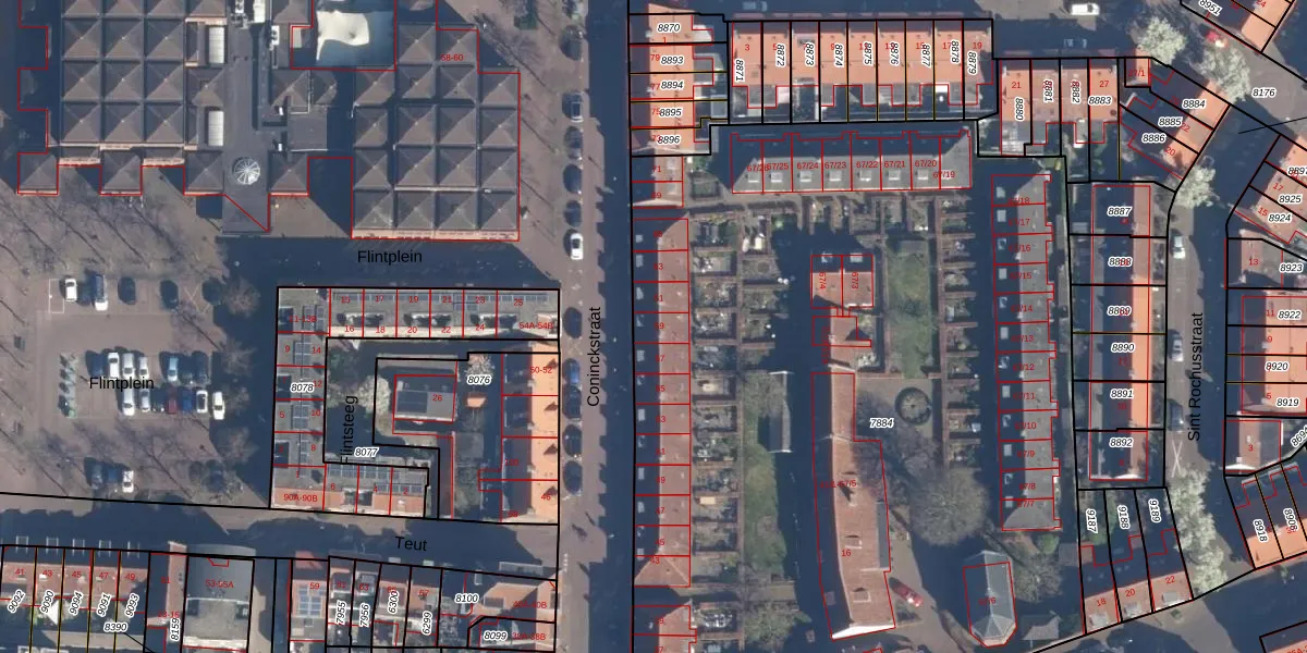 Het perceel waarop Coninckstraat 59 staat heeft een oppervlakte van 5892 m². Dit is een zeer groot perceel. De perceeloppervlakte wordt geregistreerd door het Kadaster. Gedetailleerde informatie over de maten van dit perceel kunt u vinden in het rapport Kadastrale kaart met maatvoering van Coninckstraat 59.