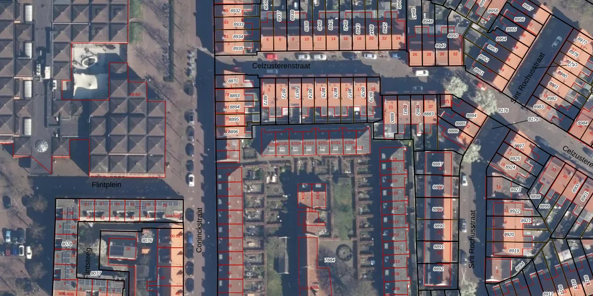Het perceel waarop Coninckstraat 67-24 staat heeft een oppervlakte van 5892 m². Dit is een zeer groot perceel. De perceeloppervlakte wordt geregistreerd door het Kadaster. Gedetailleerde informatie over de maten van dit perceel kunt u vinden in het rapport Kadastrale kaart met maatvoering van Coninckstraat 67-24.